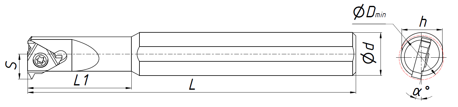 Резец резьбовой для внутренней резьбы со сменными твердосплавными пластинами. Крепление типа S (закрепление пластин винтом). Державка совместима с пластинами 22IR/NR.