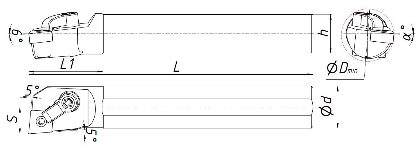 Державка токарная для внутренней обработки по металлу со сменными пластинами. Крепление типа M (прижим клин-прихватом сверху). С углом в плане 95°. Предназначена для растачивания отверстий и обработки торца. Державка совместима с пластинами CN**1204**.