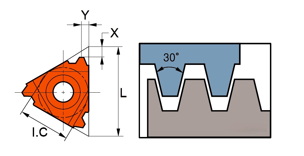 Твердосплавная резьбонарезная пластина 27IR предназначена для нарезания внутренней трапецеидальной резьбы 30° с шагом 6 мм. Пластина совместима с правой державкой.